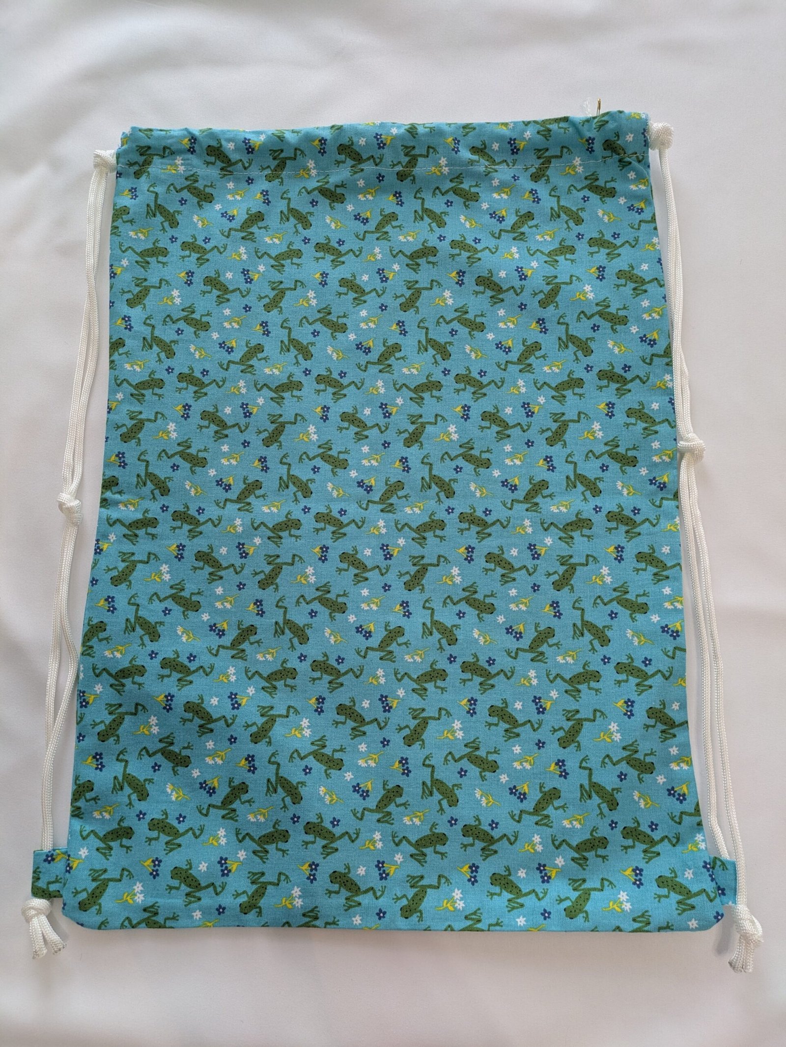 Jumping frogs on a bright aqua blue background. 100% cotton.
