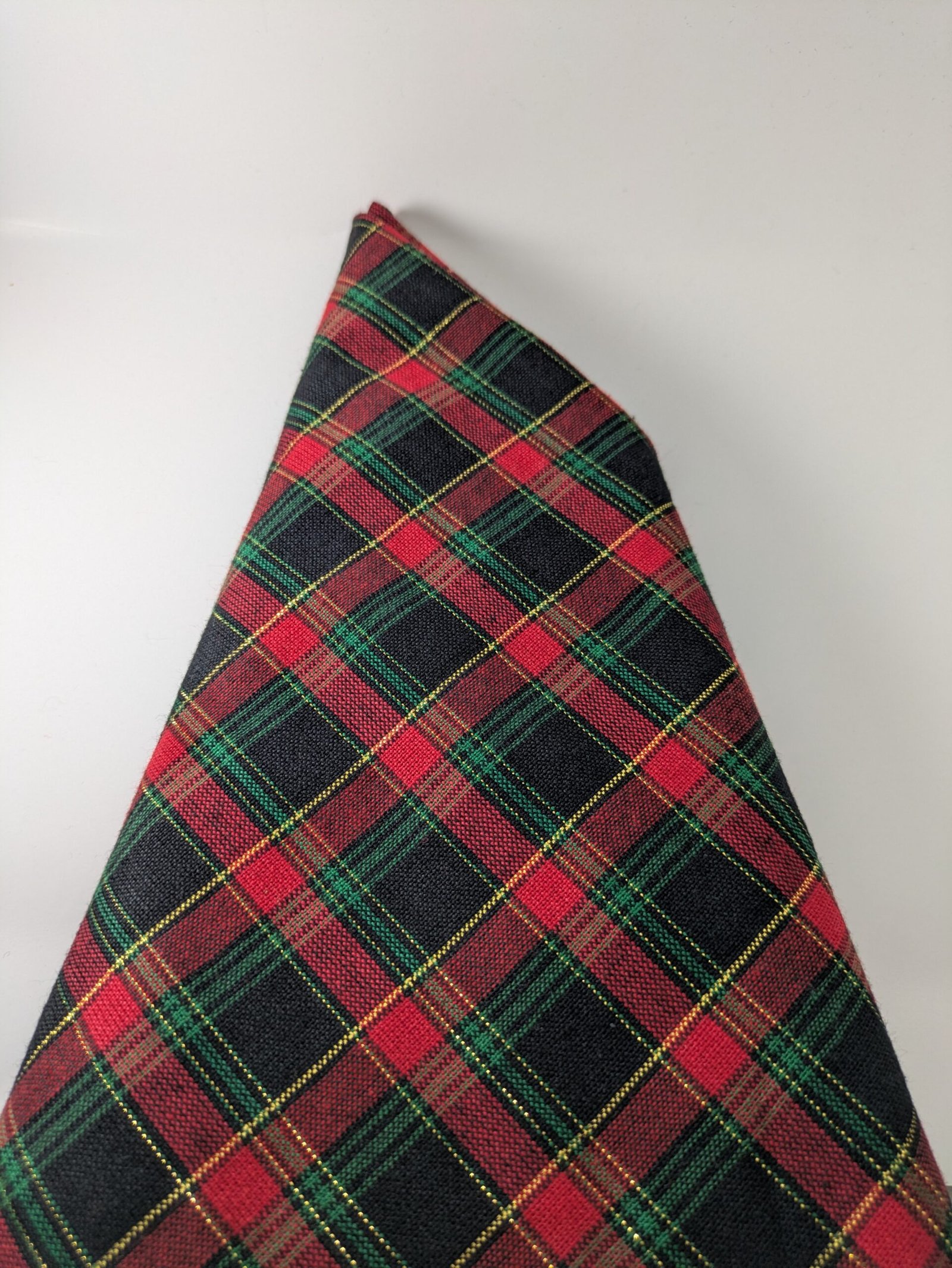 Red and green with gold accents. Christmas Tartan. 100% cotton.