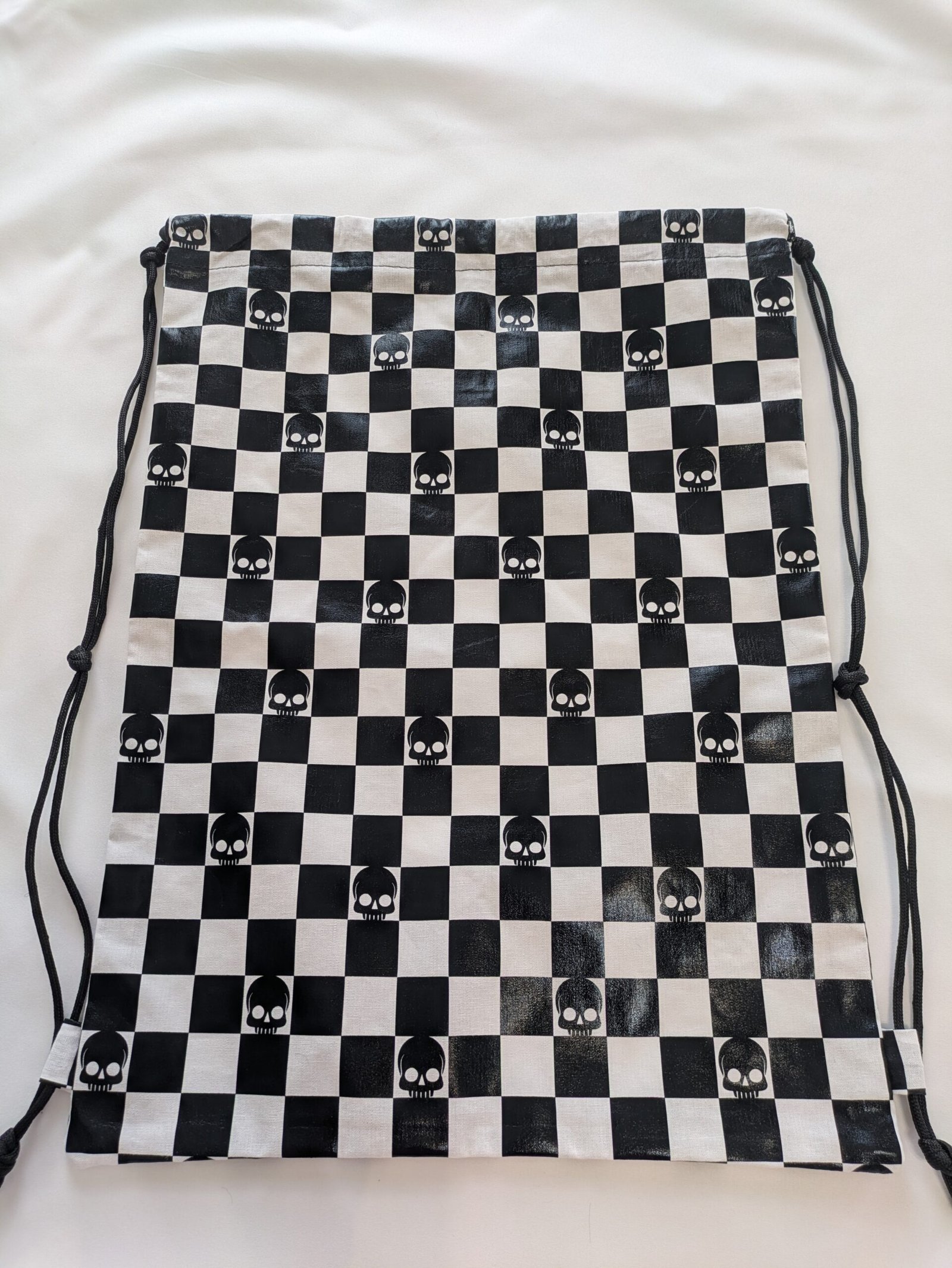 Black and white print on a shiny, vinyl-like polyester fabric.